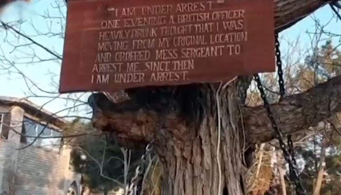 اس درخت پر انتظامیہ کی جانب سے نصب بورڈ میں تحریر ہے کہ’میں گرفتار ہوں‘،’ایک شام برطانوی افسر یہ سمجھتے ہوئے کہ میں نشے میں ہوں اور اپنی اصل جگہ سے ہل رہا ہوں، مجھے گرفتار کرنے کا حکم دیا، تب سے میں گرفتار ہوں۔