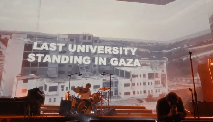 جیسے ہی بینڈ کی پرفارمنس ختم ہوئی ساتھ ہی اسٹیج پر لگی بڑی ایل ای ڈی اسکرینز پر مشرقِ وسطیٰ میں حالیہ امریکی بم باری کی فوٹیج چلا دی گئی۔